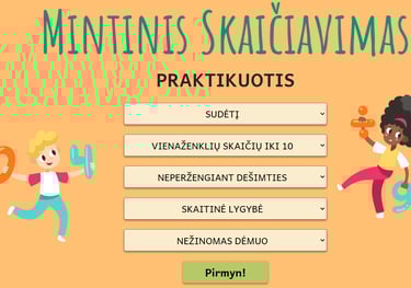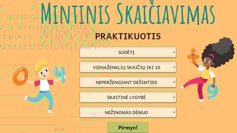 Unikali skaitmeninė priemonė, kurioje galima pasirinkti temą pagal klasę ir pasirengimo lygį. Tada pratintis atlikti įvairiausius veiksmus mintinai, tobulinti skaičiavimo įgūdžius bei efektyvinti skaičiavimo tempą. Priemonė tinkama tiek darbui klasėje, tiek vaikų treniruotėms namuose. Spauskite čia.